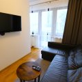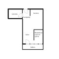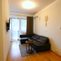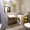 Rozkład pomieszczeń: przedpokój, salon z aneksem kuchennym oraz wydzieloną częścią do spania, łazienki z WC.