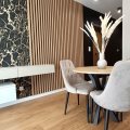 Kuchnia w pełni wyposażona w sprzęt AGD: lodówka w zabudowie, okap, płyta indukcyjna, piekarnik z funkcją mikrofali, zmywarka,