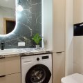 • nowoczesnej łazienki z prysznicem typu walk-in, pralką, zabudowanymi szafkami oraz koszem na odzież do prania,