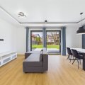 - salon wyposażony w sofę, stół z krzesłami oraz szafkę RTV, z wyjściem na ogród,