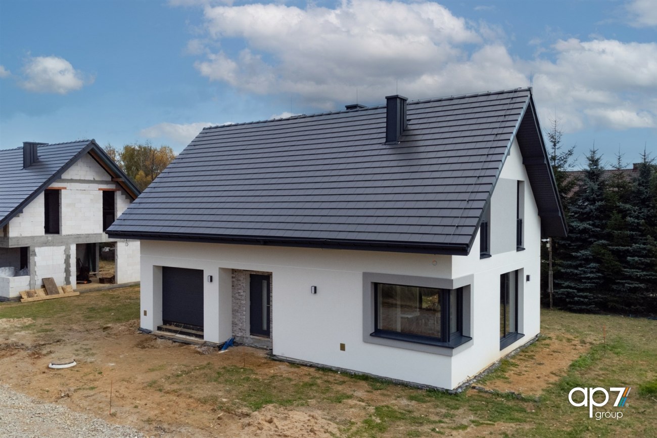 Standard w skrócie: okna 3-szybowe PCV+ rolety elektryczne antywłamaniowe ALUPROF w całym domu, drzwi Wiśniowski NOVA z ościeżnicą aluminiową, brama garażowa Wiśniowski UNI PRO, tynki gipsowe KNAUF, ogrzewanie podłogowe, dachówka cementowa BRAAS TEVIVA, ocieplenie: styropian 20cm, tynk: sylikonowy.